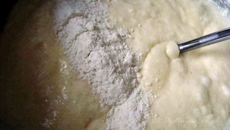 3. Dodawać -przesianą wcześniej- mąkę z proszkiem i delikatnie wymieszać. Na koniec dodać mieszankę ulubionych- drobno posiekanych- suszonych owoców i orzechów i delikatnie wymieszać ciasto.